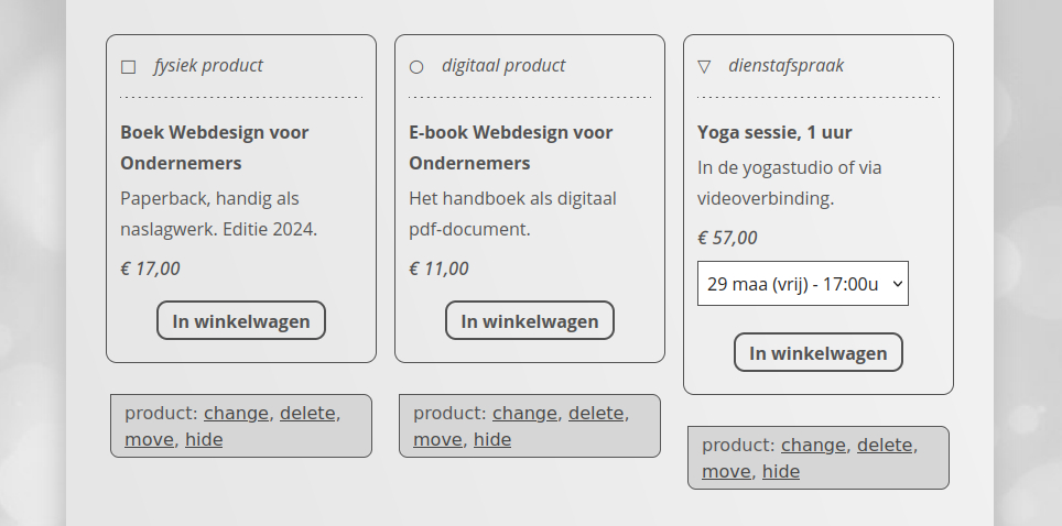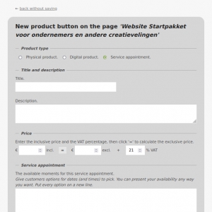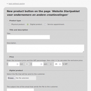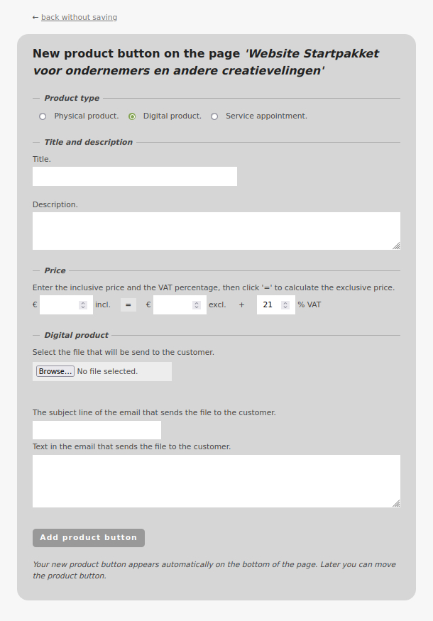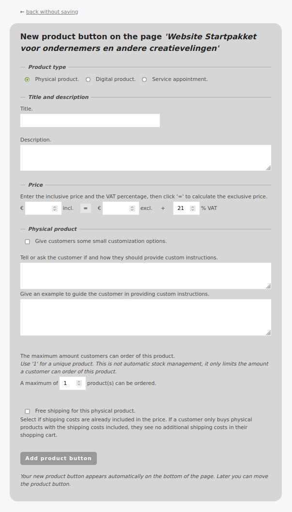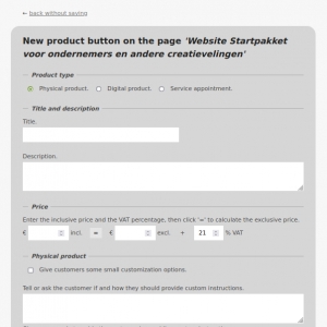 Ook een productknop toevoegen is heel makkelijk. Je kunt kiezen of je een fysiek of digitaal product aanbiedt, of een dienstafspraak.